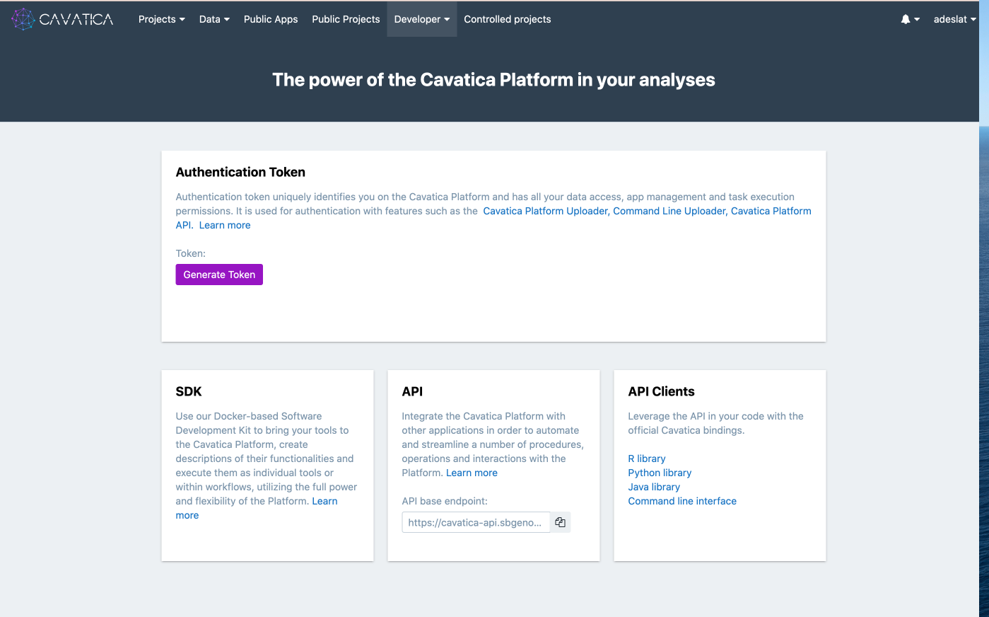For your own repository -- replace adeslat with your own [CAVATICA USERID].