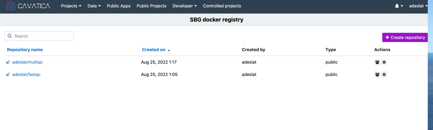 Note that we have the Docker Image Repository Specific to me is at the location of pgc-images.sbgenomics.com/adeslat.